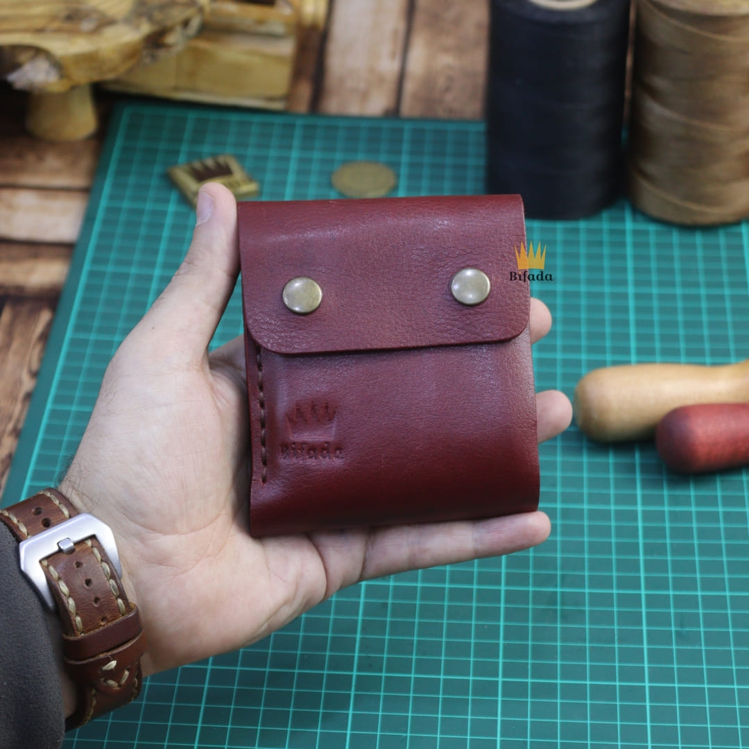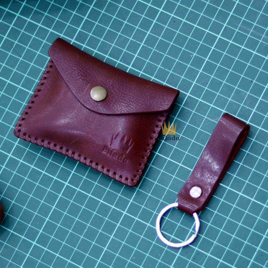 محفظة مميزة من الجلد الطبيعي لحمل النقود المعدنية أو البطاقات + علاقة مفاتيح مجانا (اللون الأحمر العنابي) CP