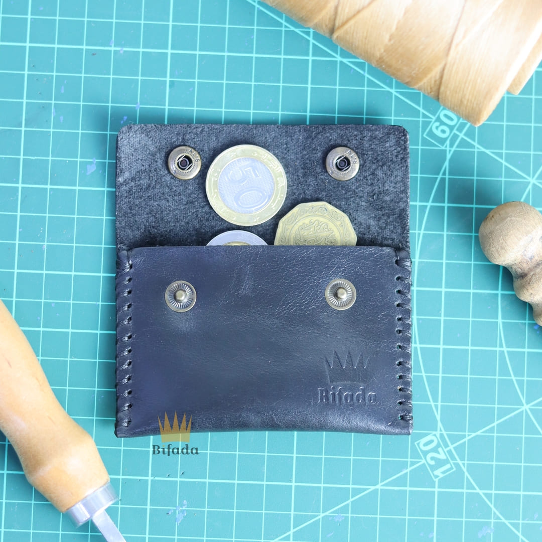 محفظة من الجلد الطبيعي لحمل النقود المعدنية أو البطاقات مصنوعة باليد (اللون الأسود) B